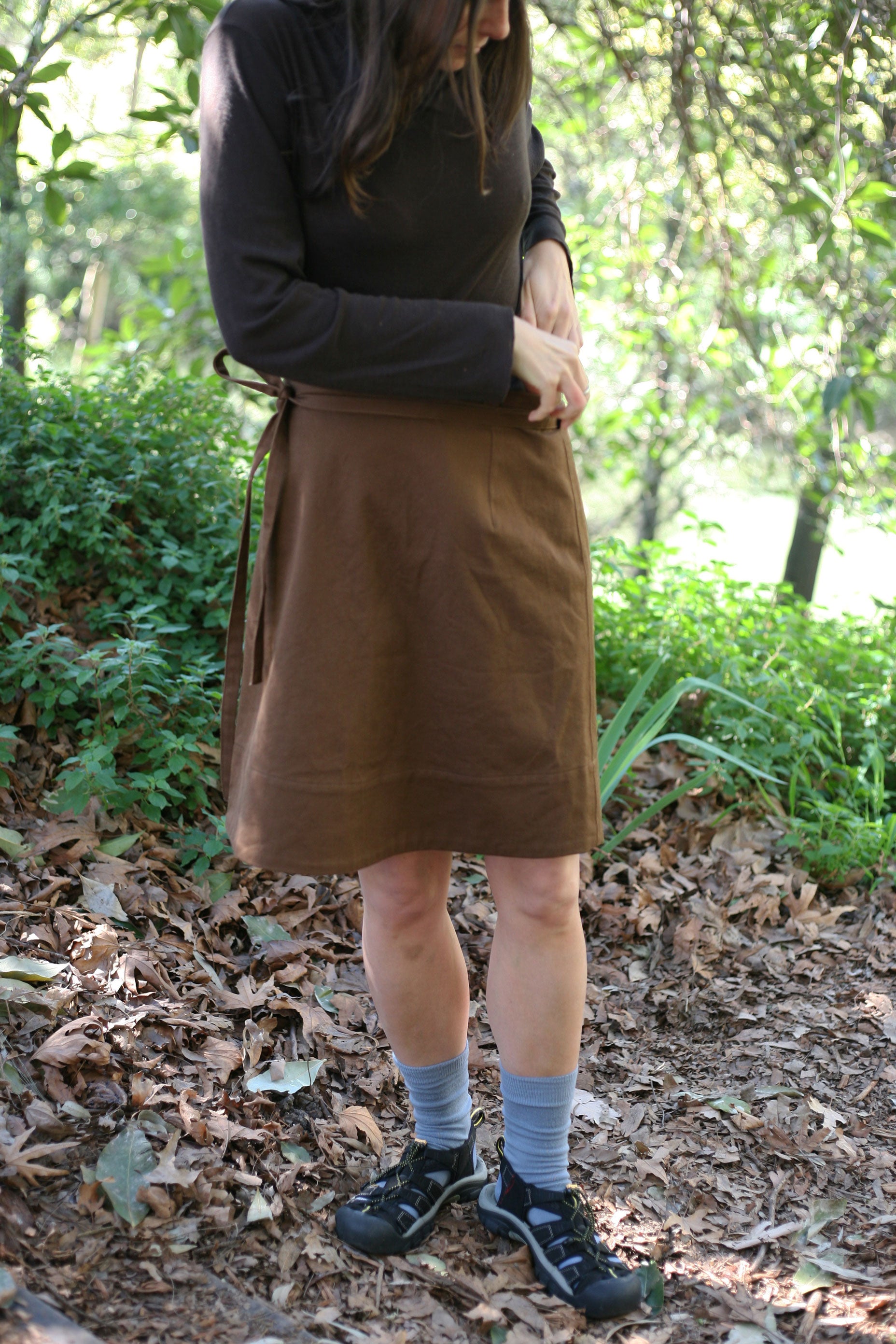 The Cross Back Skirt is an adjustable wrap skirt, featuring front and back darts for shaping, and horizontal in-seam pockets with loop and button closure through the waistband at both side front and back. Deep 10cm hem, split opening can be worn at the back as name suggests, or turned towards the front.