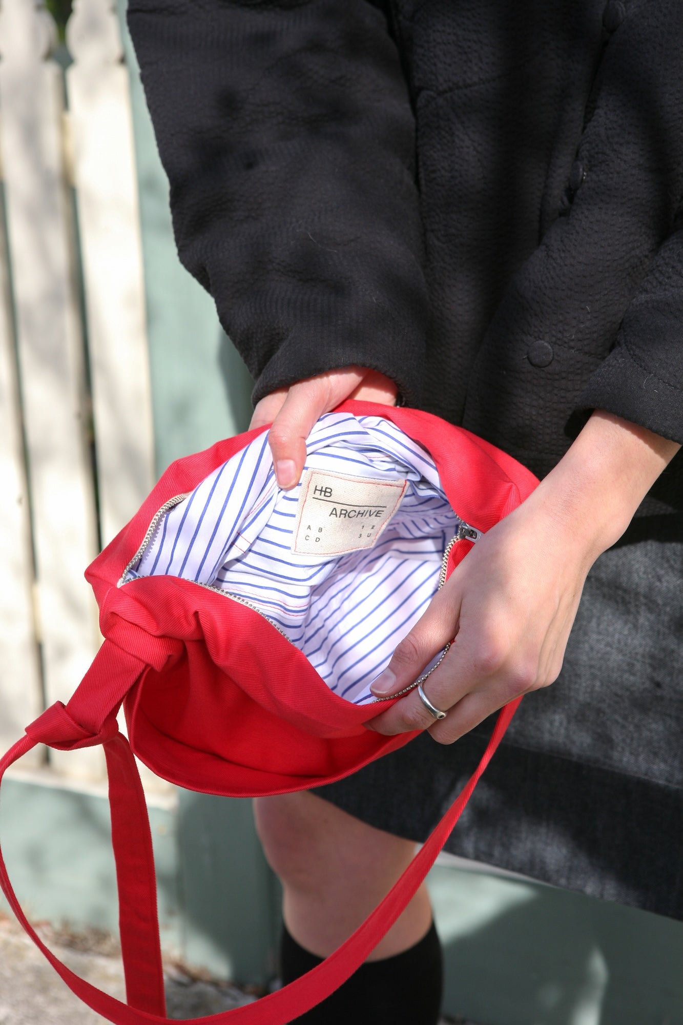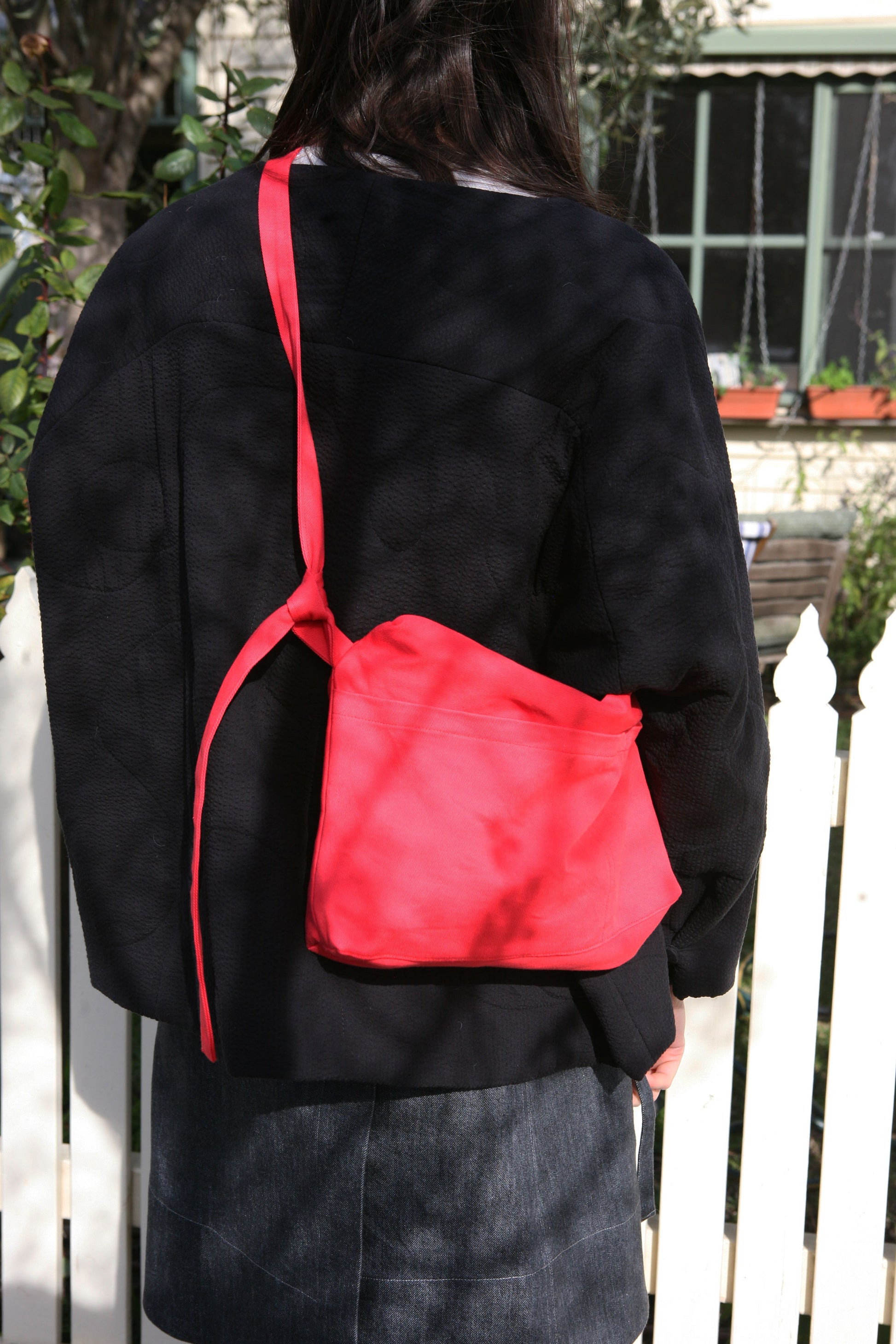 This LIMIT bag features an external patch pocket, stitched to become two. Zip closure with another pocket inside. Adjustable strap fastening through loop with a knot or single eared bow. Options to wear include over shoulder, across body, or around the waist.