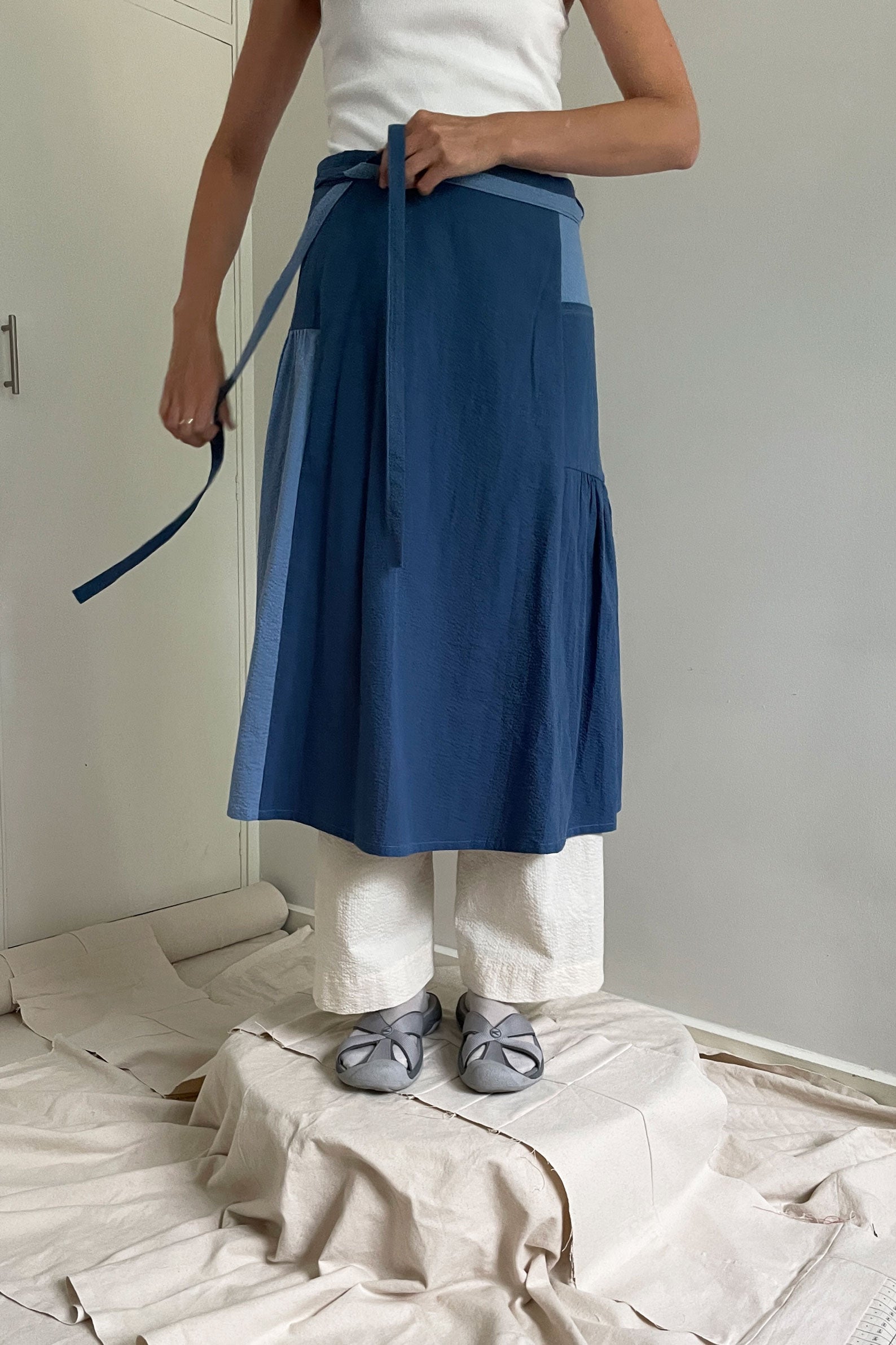 The Frill CBS is a LIMIT iteration of the adjustable wrap style Cross Back Skirt. Featuring asymmetrical gathered panels, and side patch pocket. Internally finished with flat fell and french seams. Celebrating play, beautiful seams, and working with what I've got.