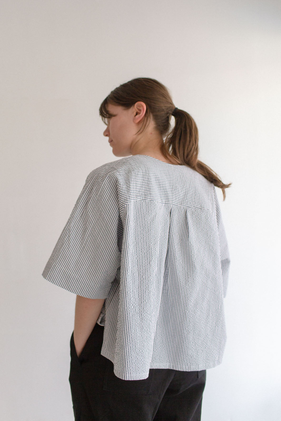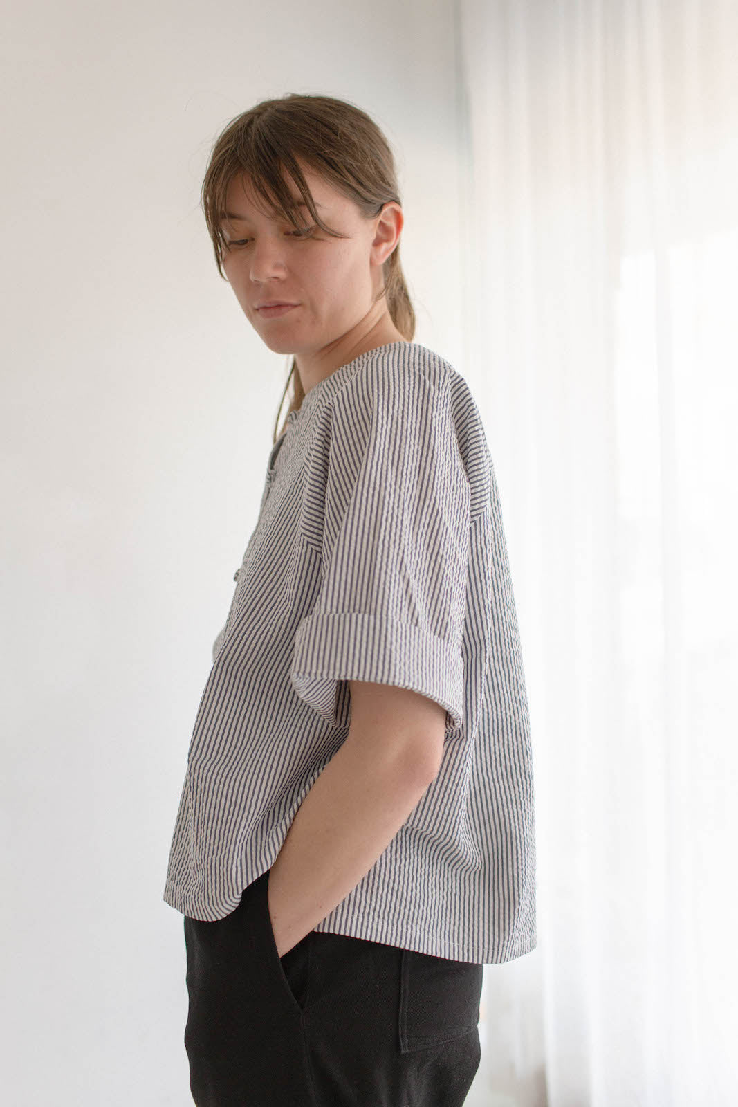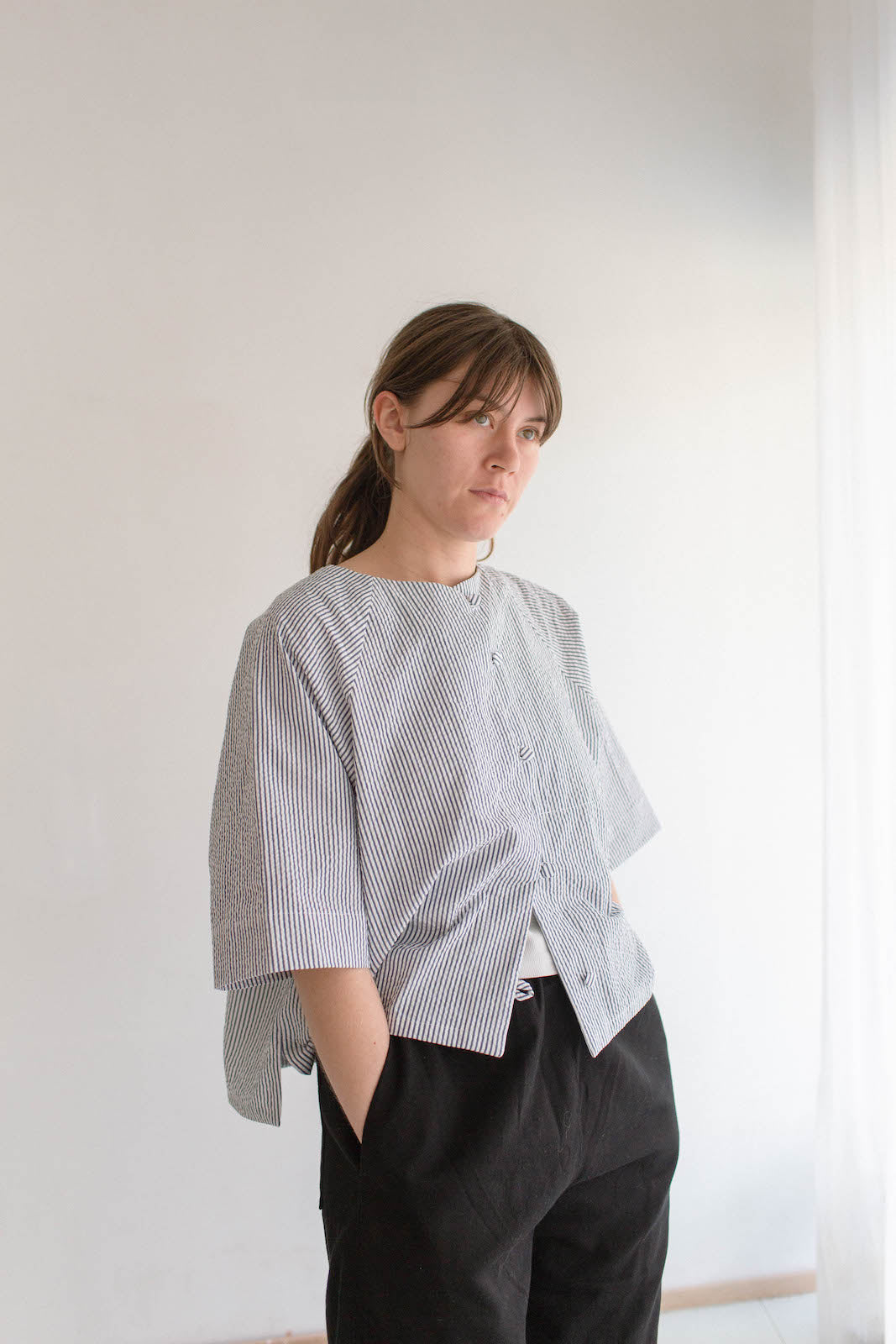 Umi is 165cm tall, generally wears size 8-10. Here, she is wearing a size A in Navy / White Stripe Seersucker. The Poet is oversized in nature, these shirts will fit a range of bodies, shapes and sizes.