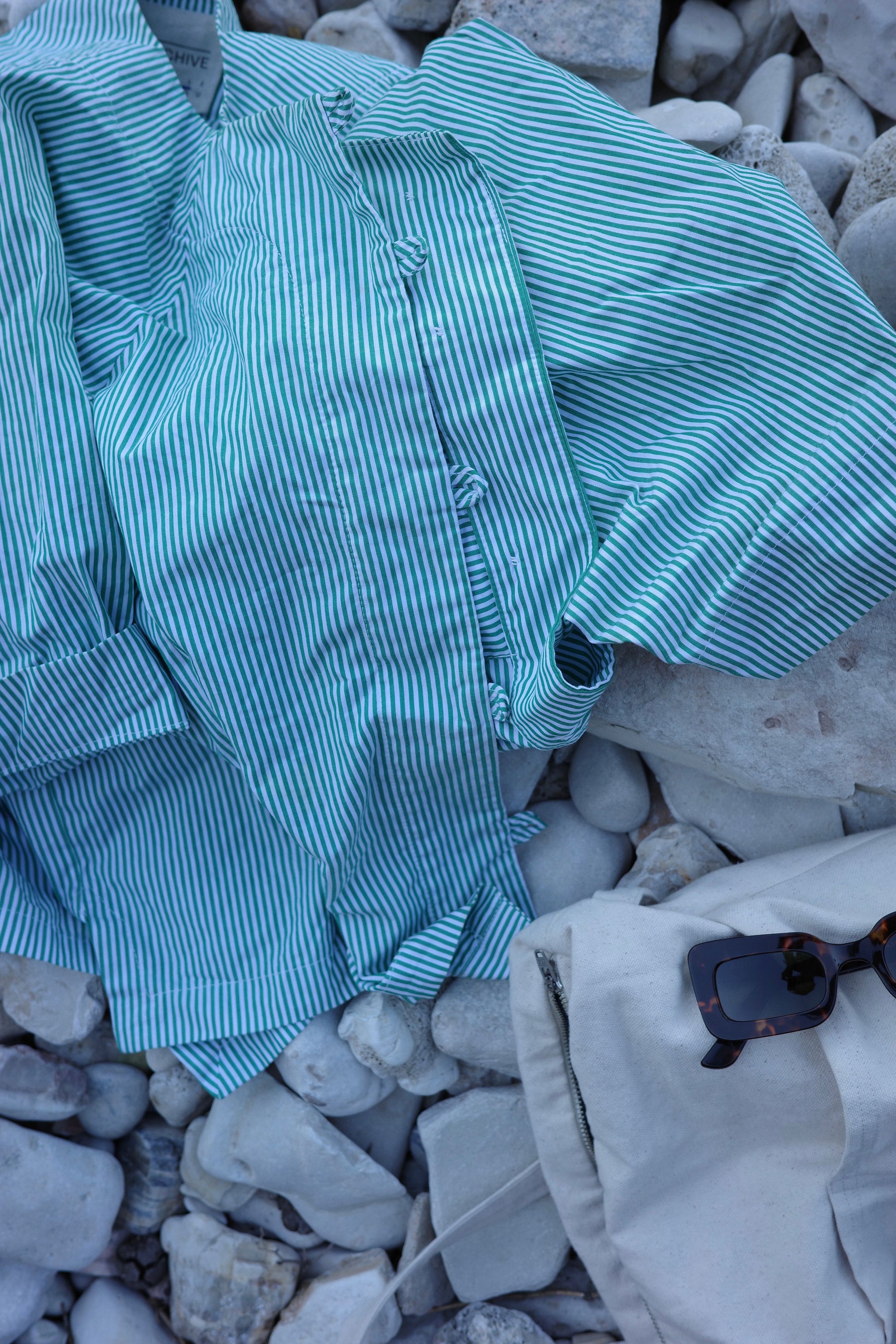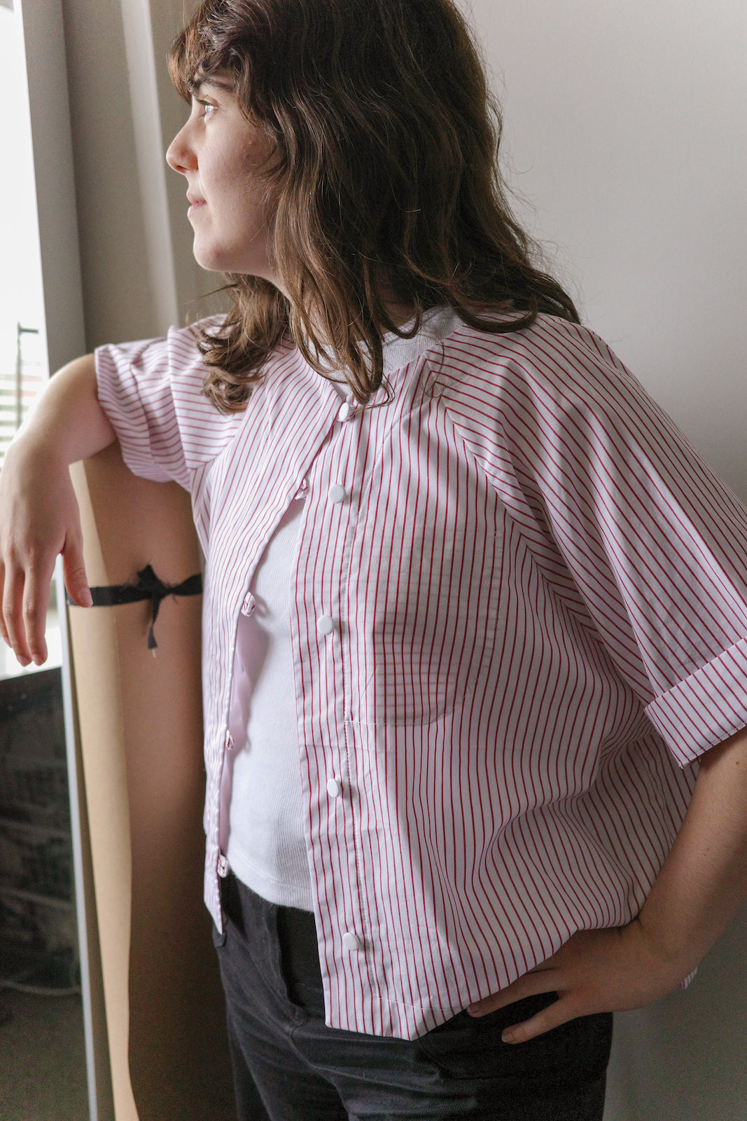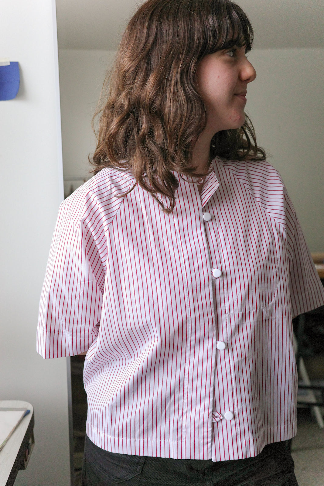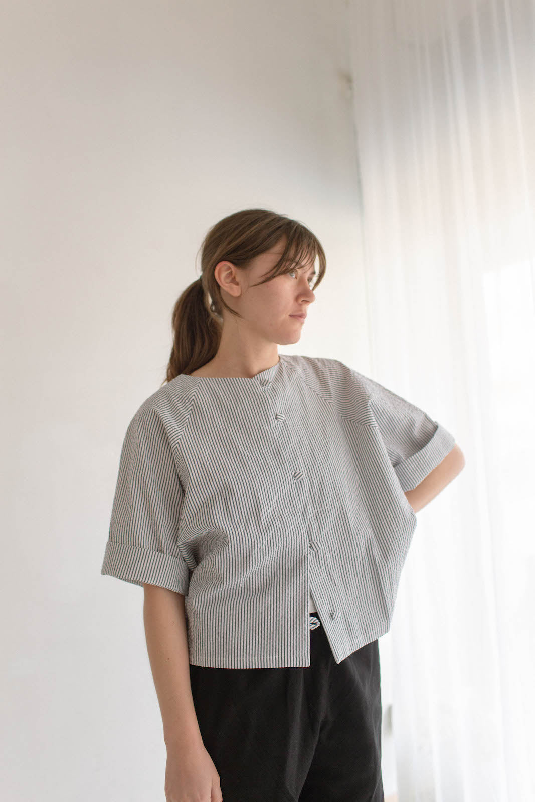 Umi is 165cm tall, generally wears size 8-10. Here, she is wearing a size A in Navy / White Stripe Seersucker. The Poet is oversized in nature, these shirts will fit a range of bodies, shapes and sizes.