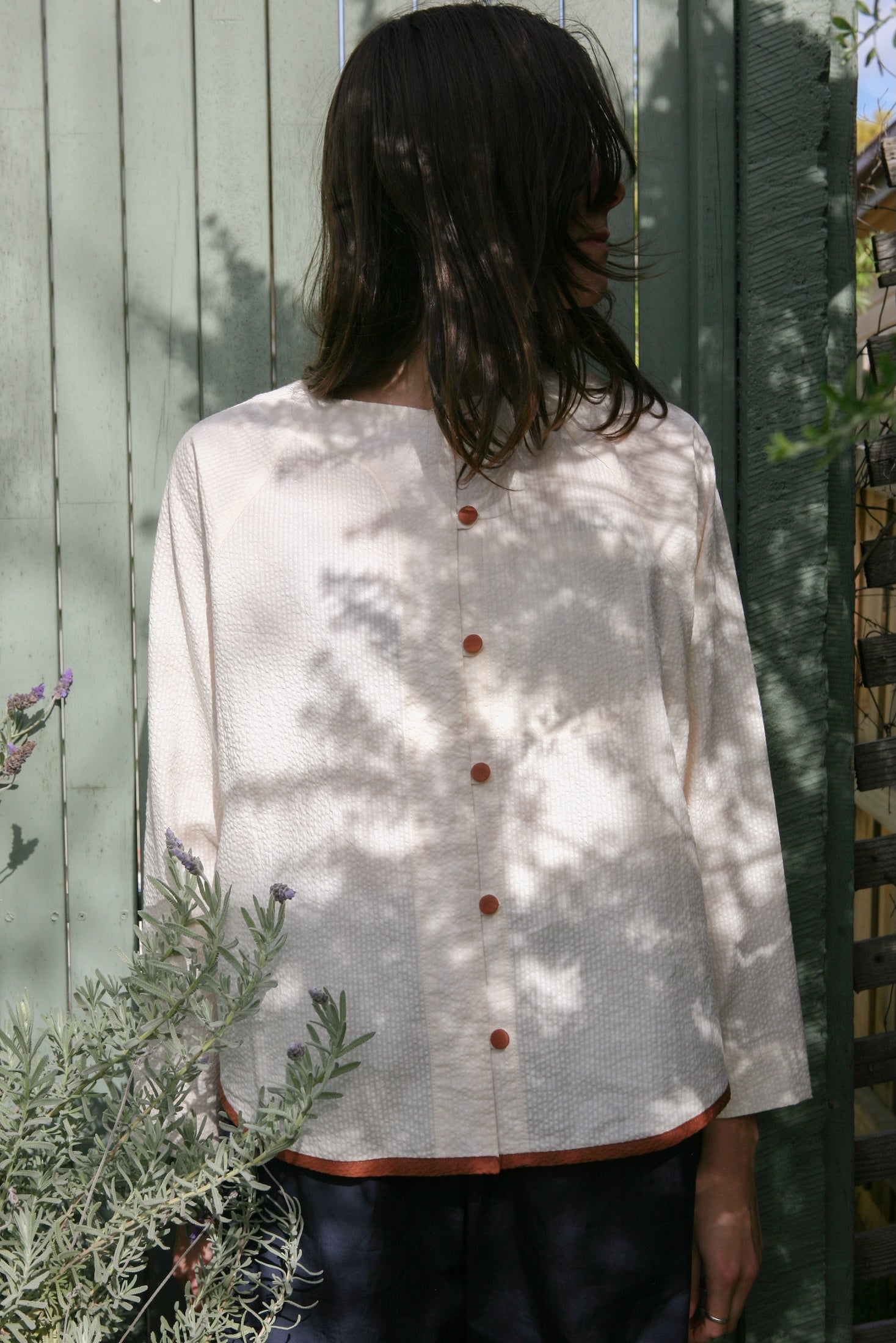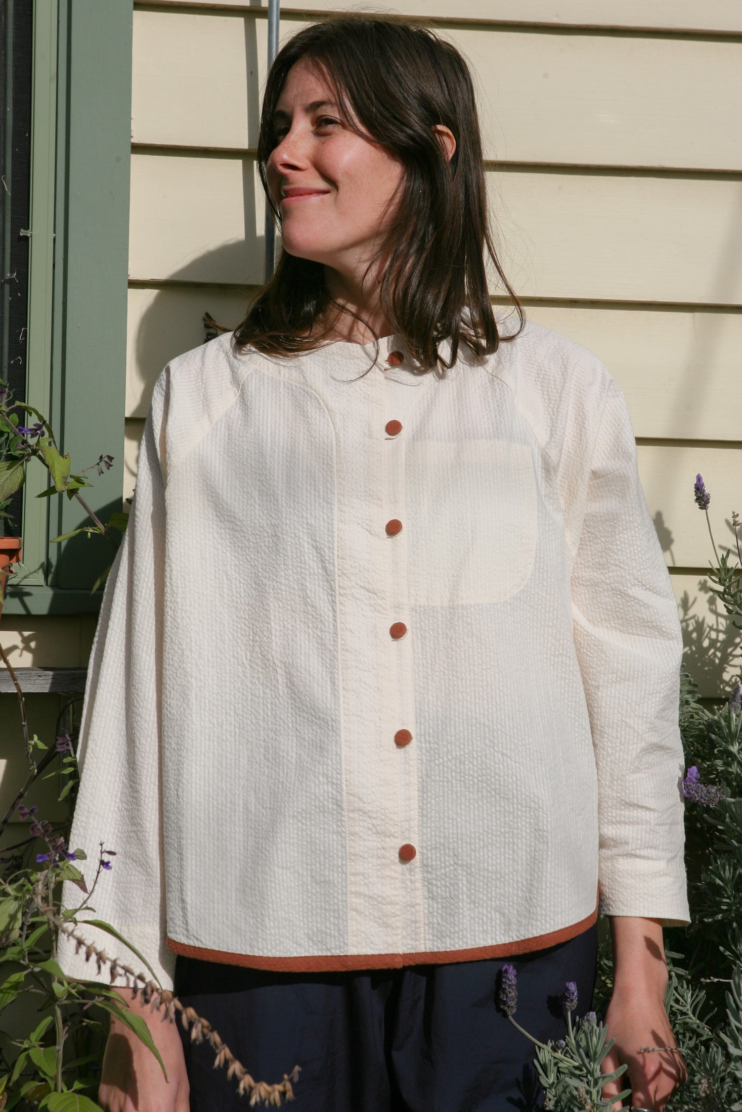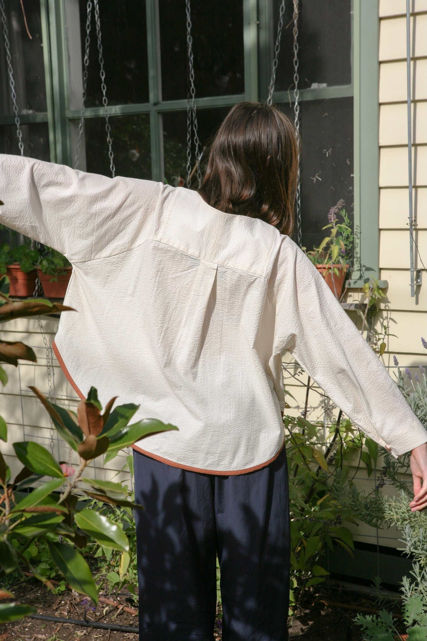 Cream with contrasting Cinnamon. Hem traced from my own (and the first) Tuxedo iteration. Inspired by a memory of two shirts my mum bought my sister and I when we were young.