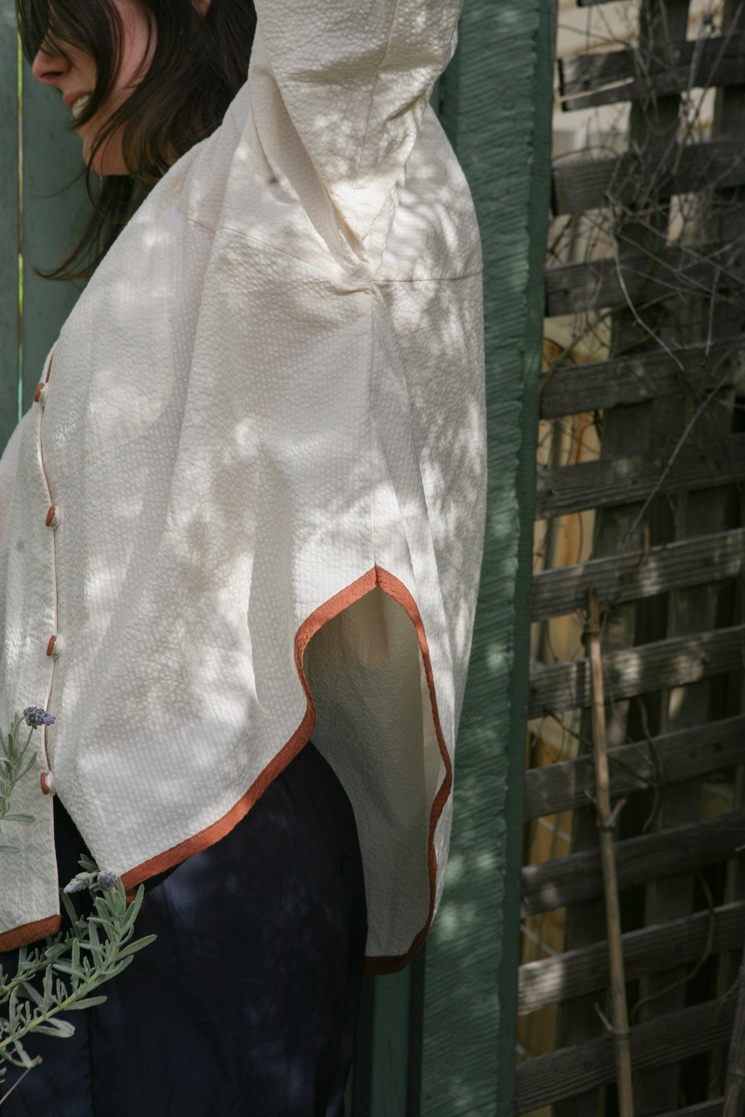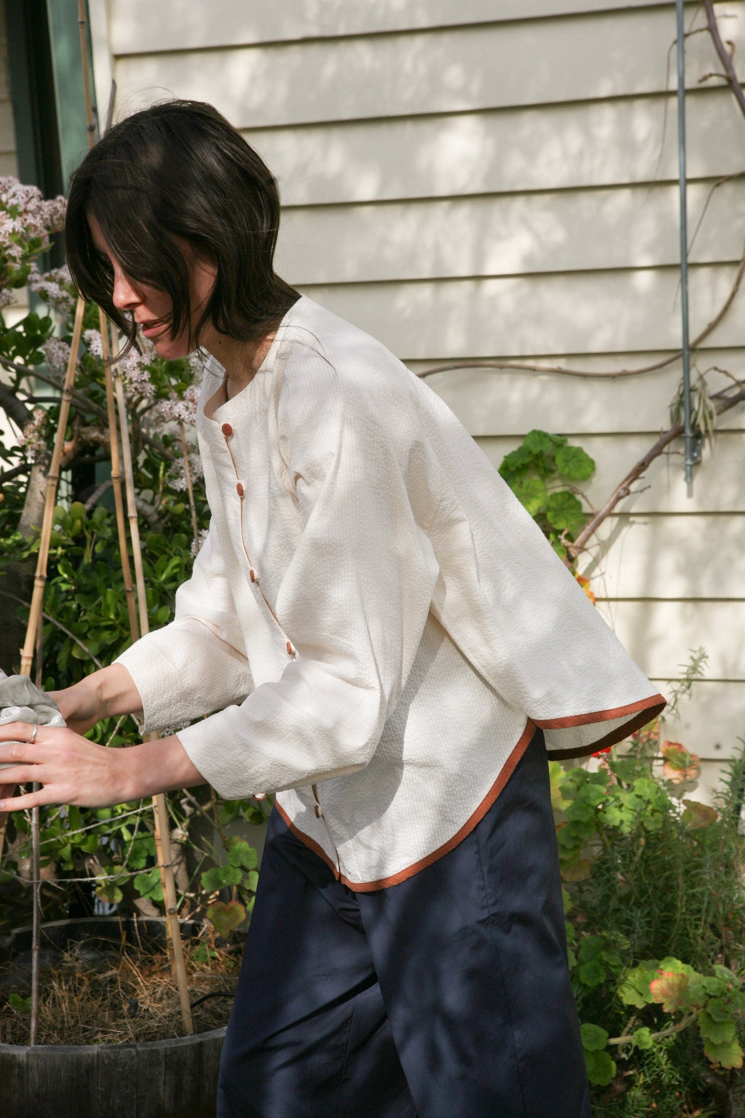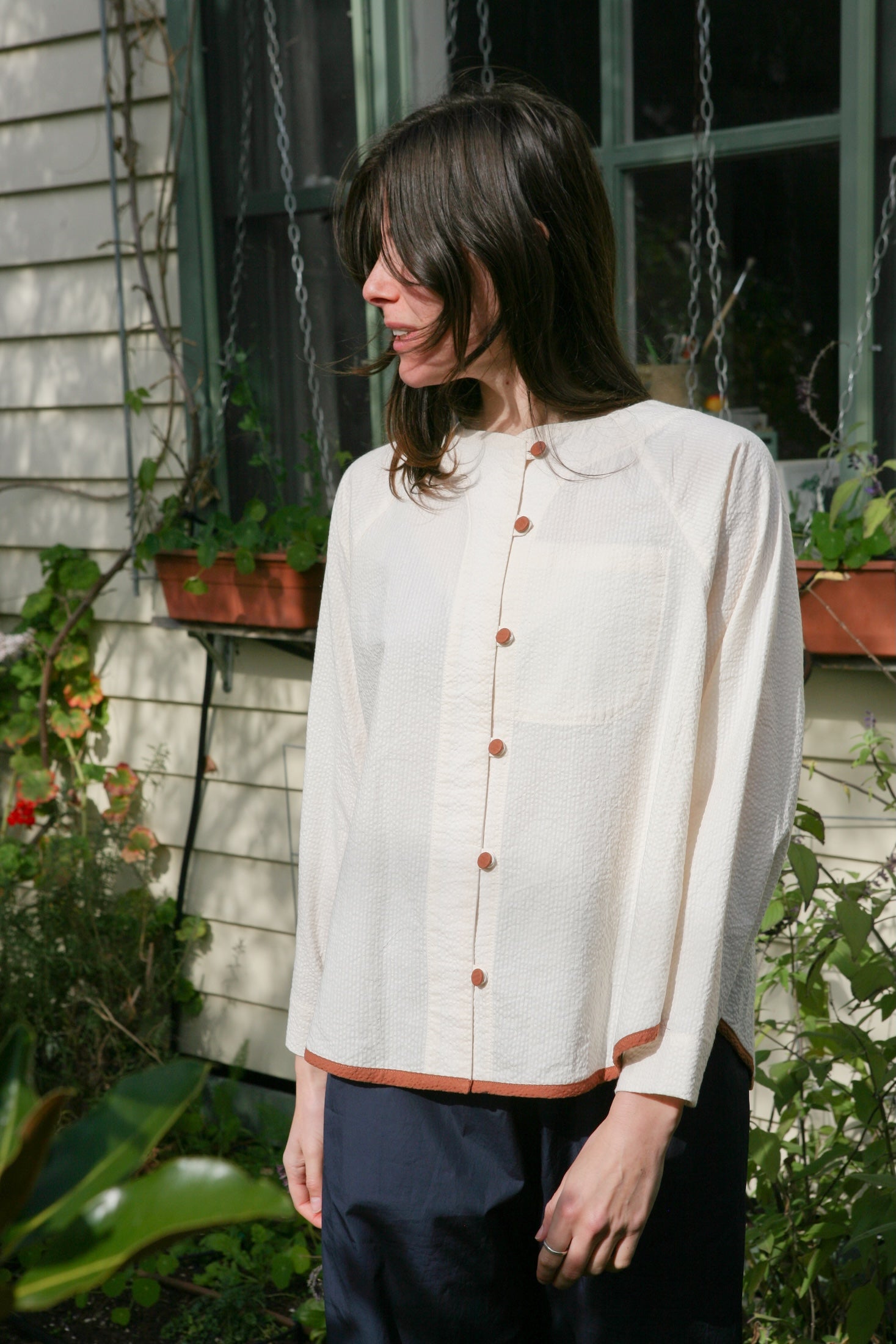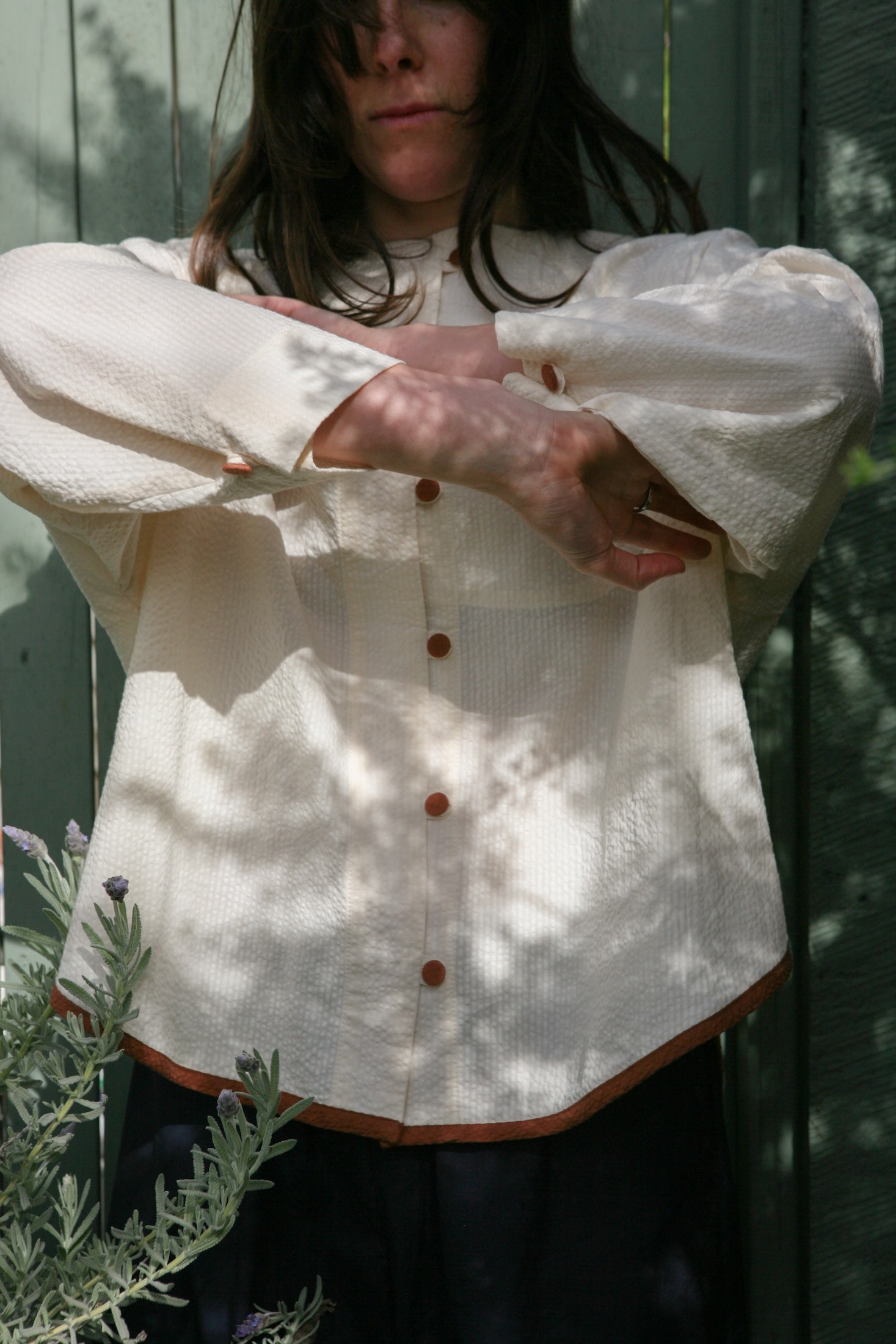 Cream with contrasting Cinnamon. Hem traced from my own (and the first) Tuxedo iteration. Inspired by a memory of two shirts my mum bought my sister and I when we were young.