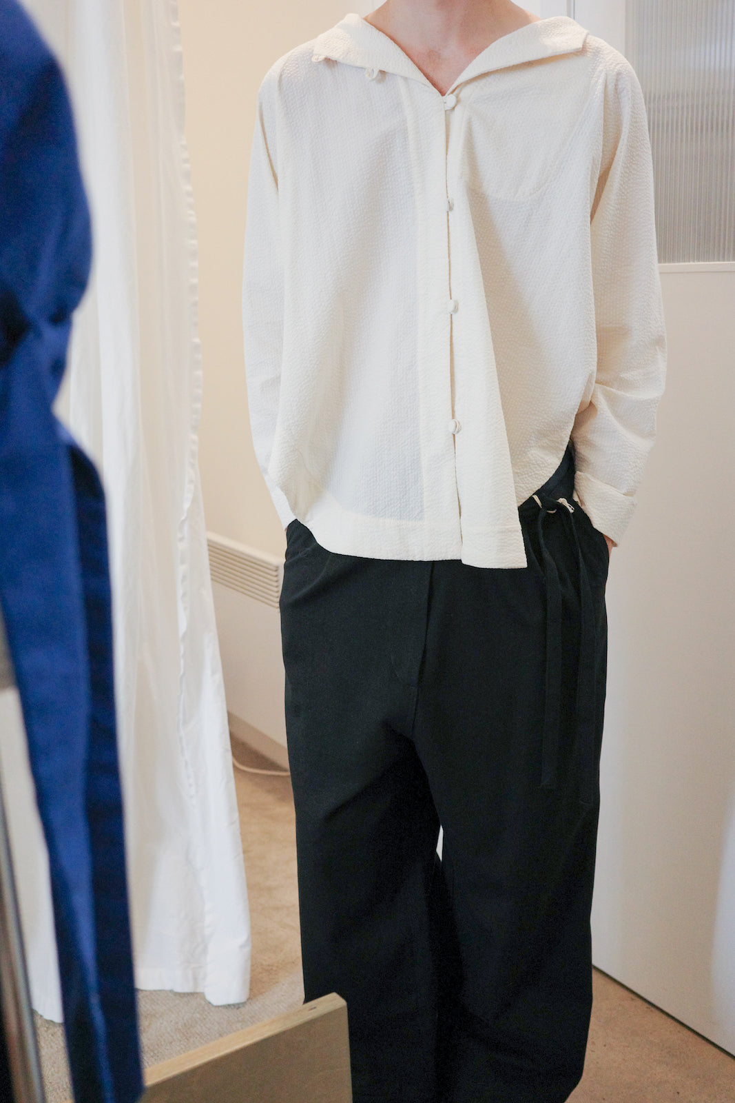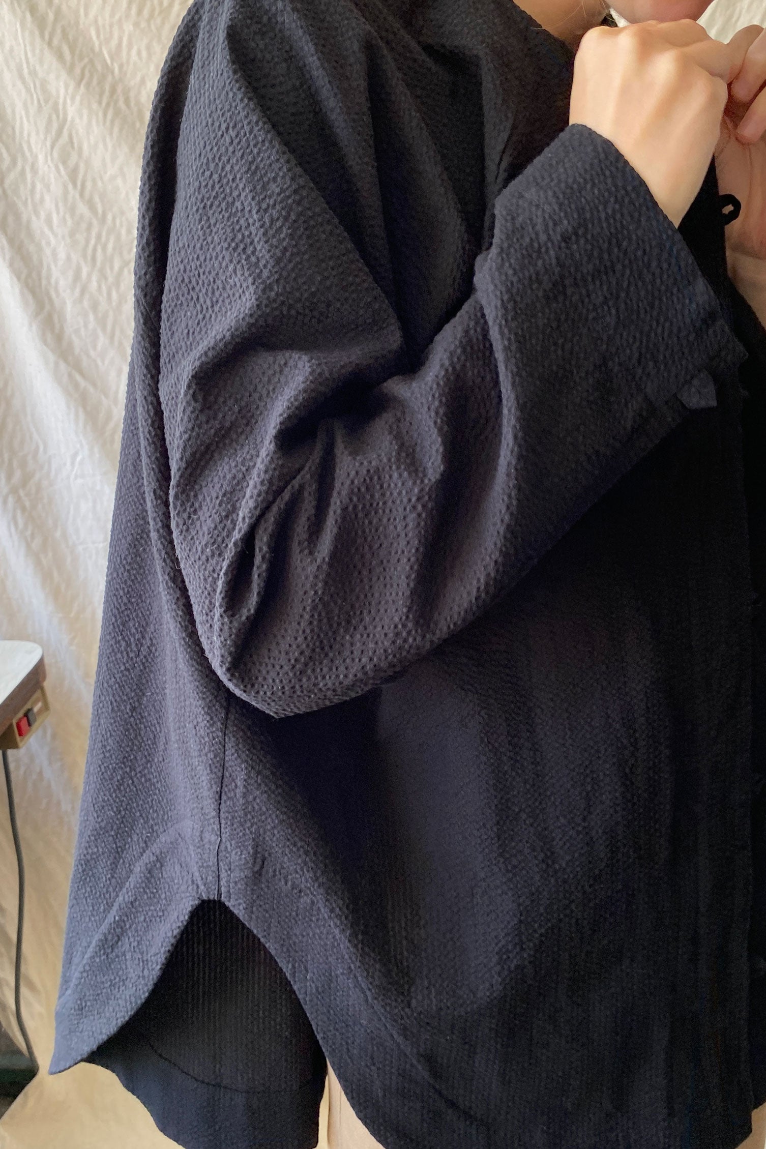 The Poet is an oversized shirt with a raglan sleeve at front, leading to a yoke at the back; details that are apparent in multiple HB Archive pieces. Featuring loop and button closure, and internal facings.
