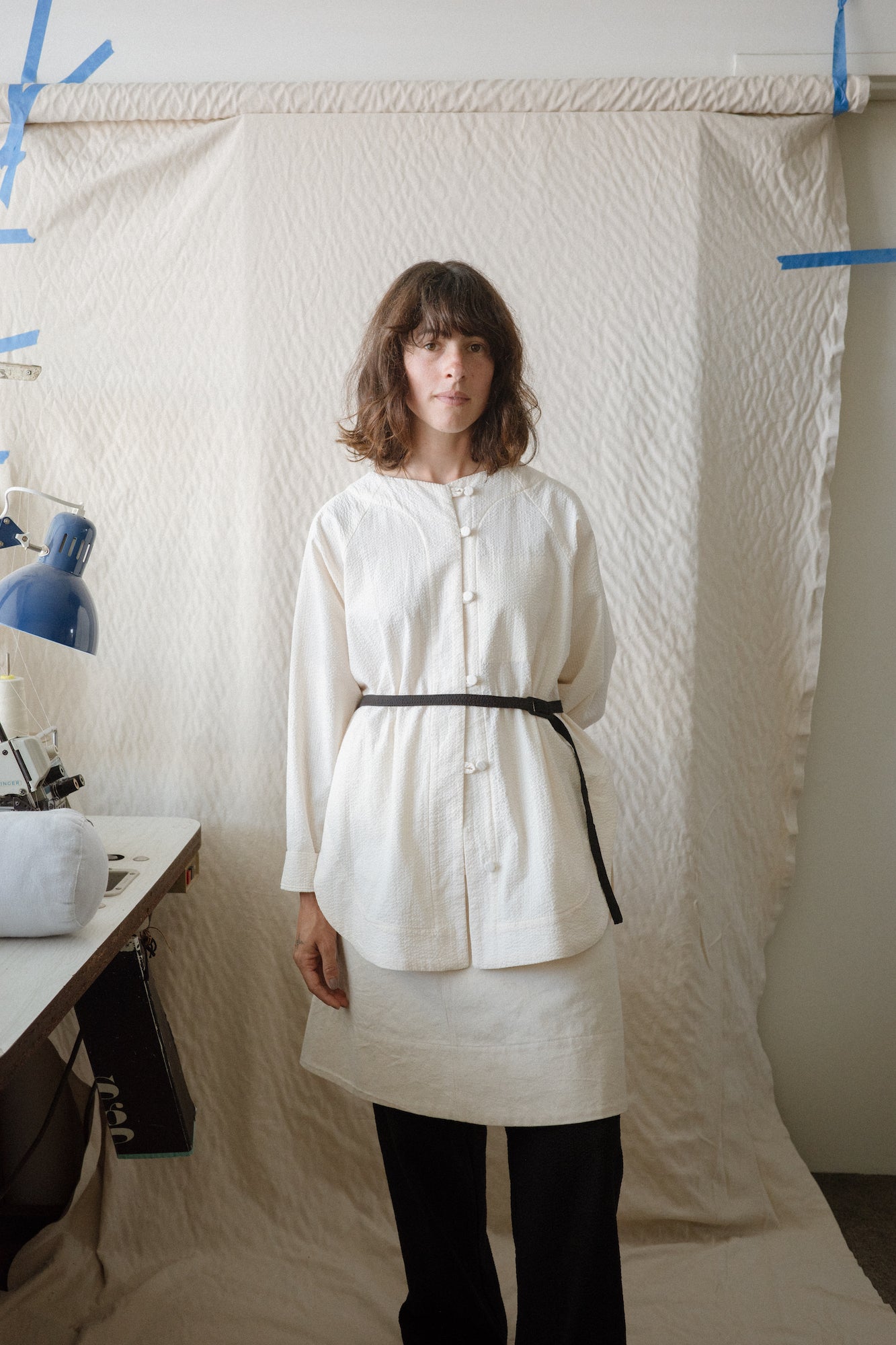 First created in 2017, The Poet Shirt has been made in countless fabrics, sleeve and hem lengths and shapes, and collar styles. After three years of sampling, fitting on multiple body’s, and thinking, the photographed edition is remarkably similar to it’s original. First named the O.S Shirt (Over Sized), I finally landed on the ‘Poet’ while listening to Patti Smith read Just Kids as I sewed. It feels right to name it after her, I think it’s something she would like.