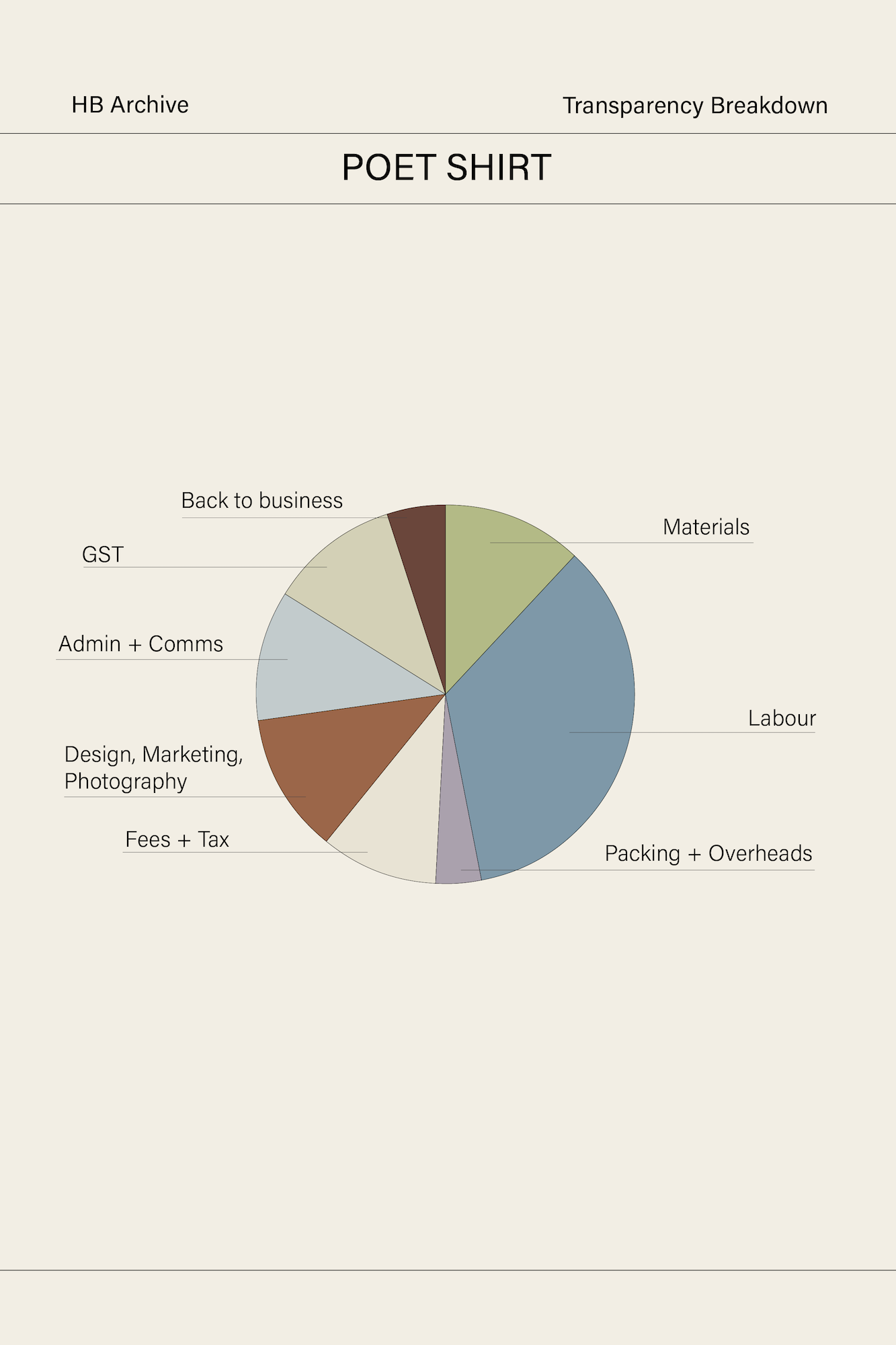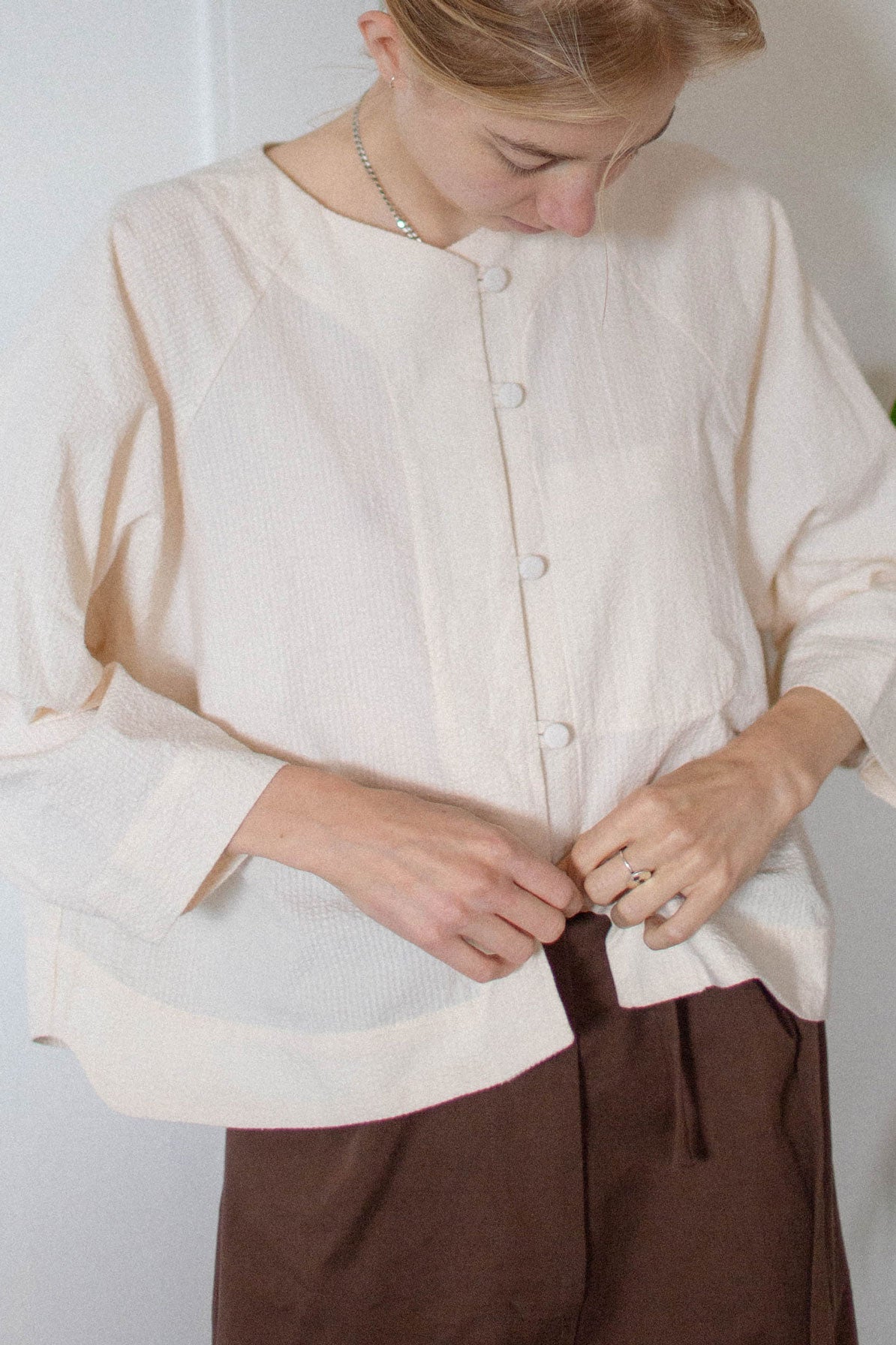 The Poet is an oversized shirt with a raglan sleeve at front, leading to a yoke at the back; details that are apparent in multiple HB Archive pieces. Featuring loop and button closure, and internal facings.