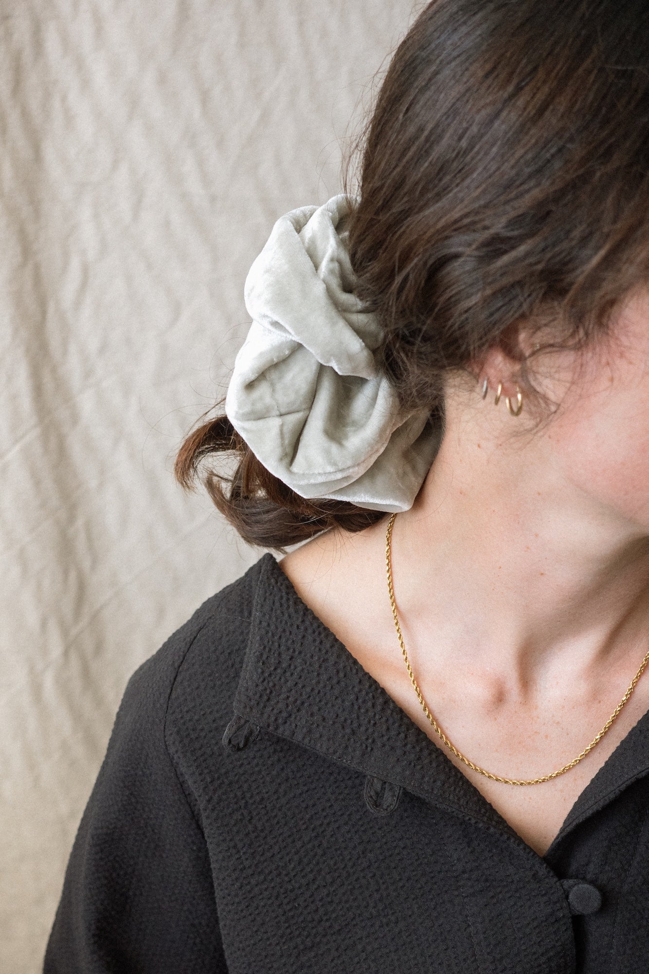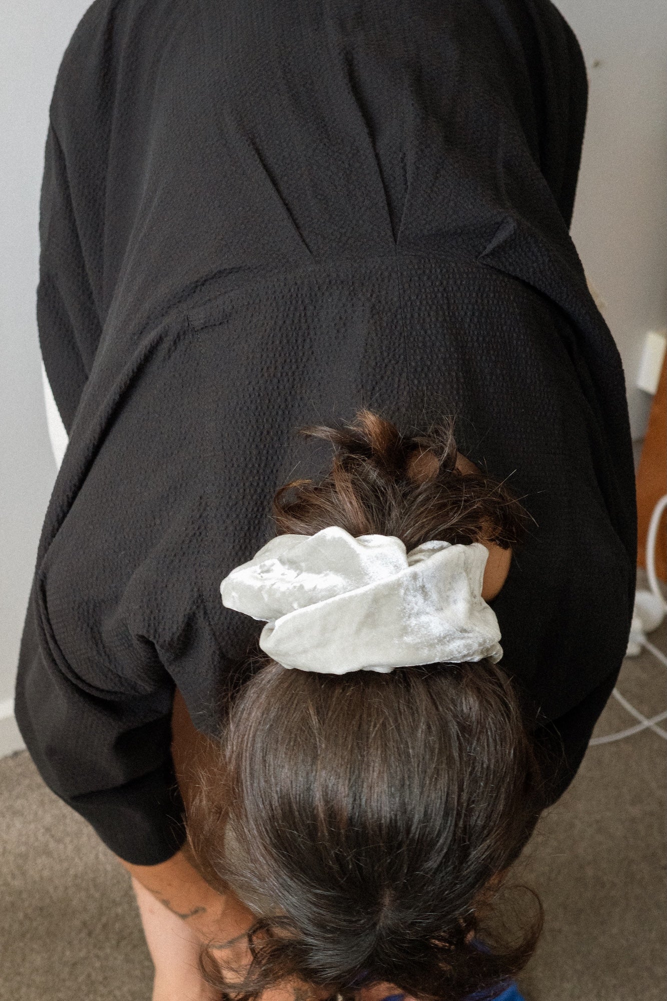 Silver Velvet scrunchie made of a silk/ viscose blend. Locally sourced designer surplus fabric.