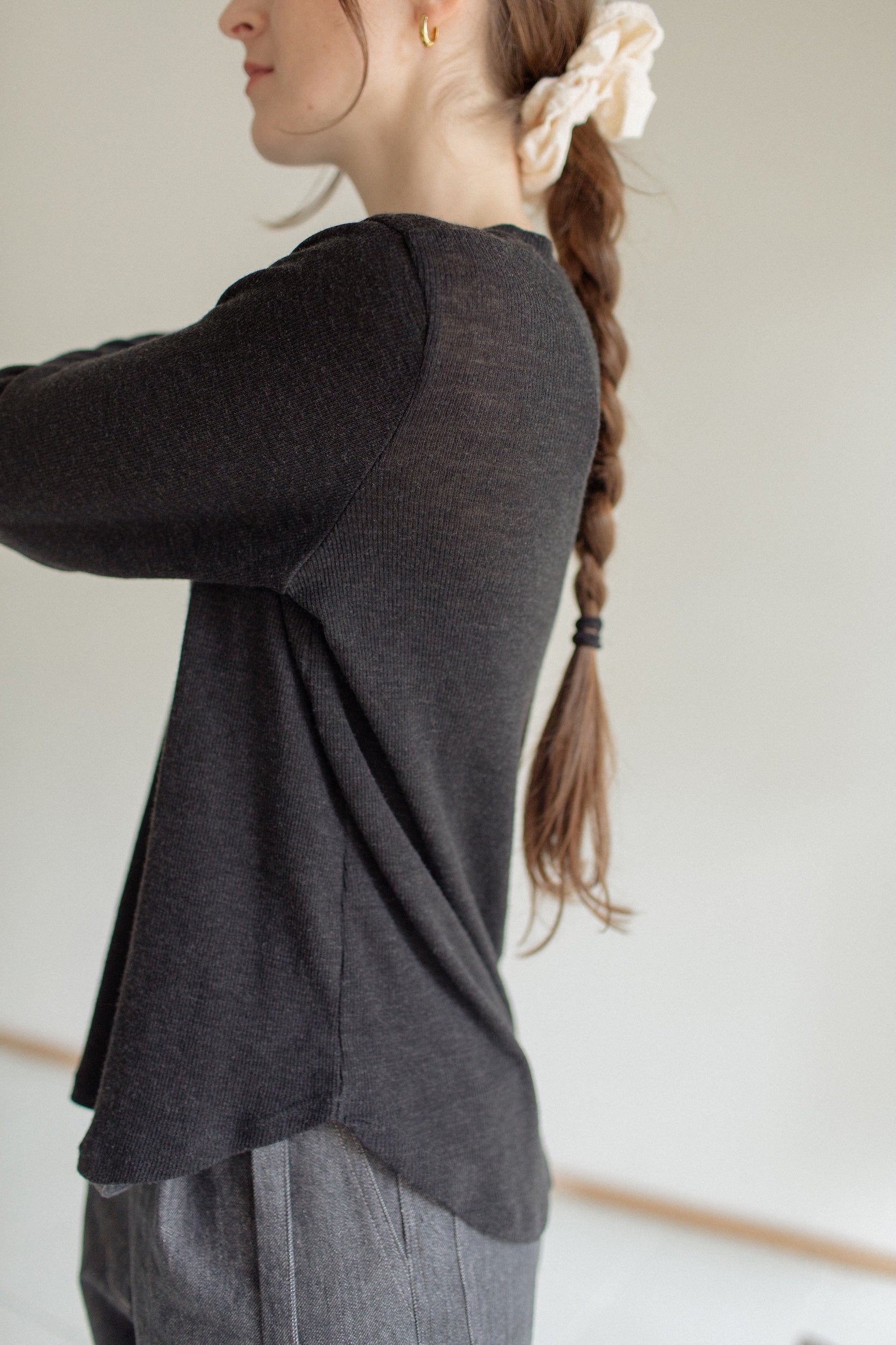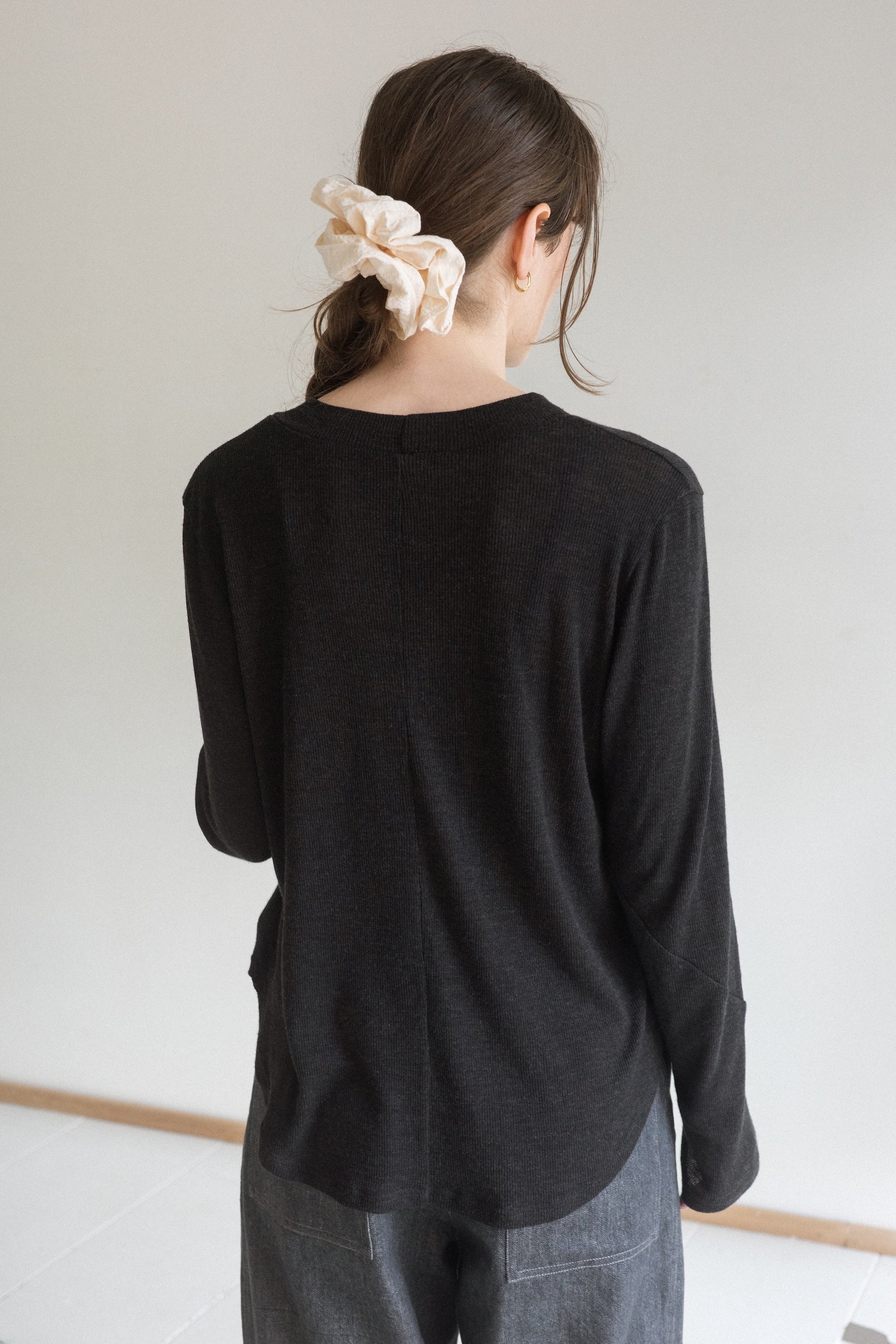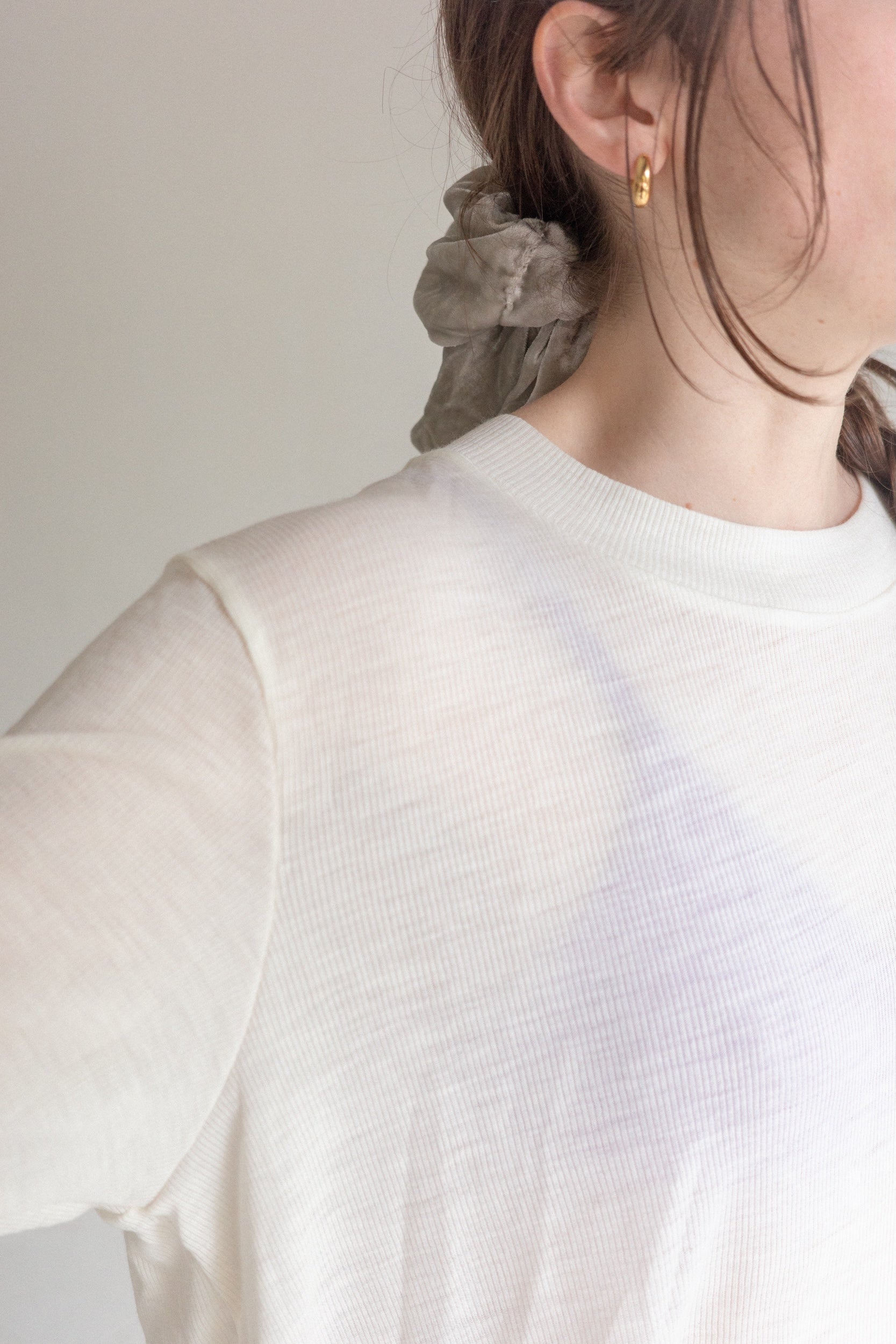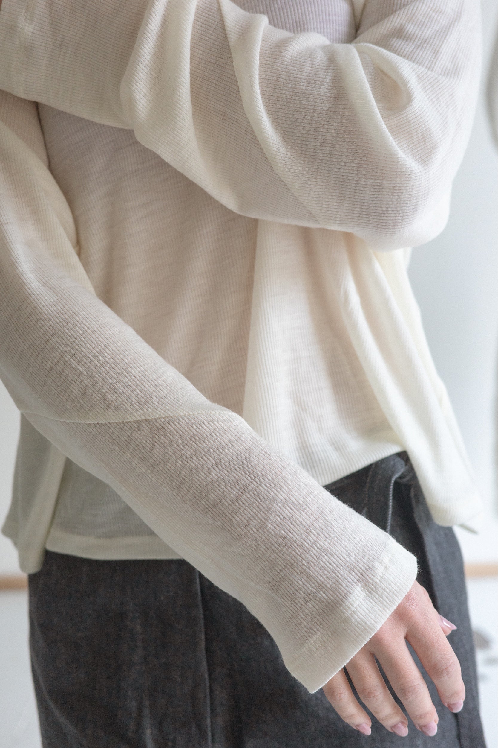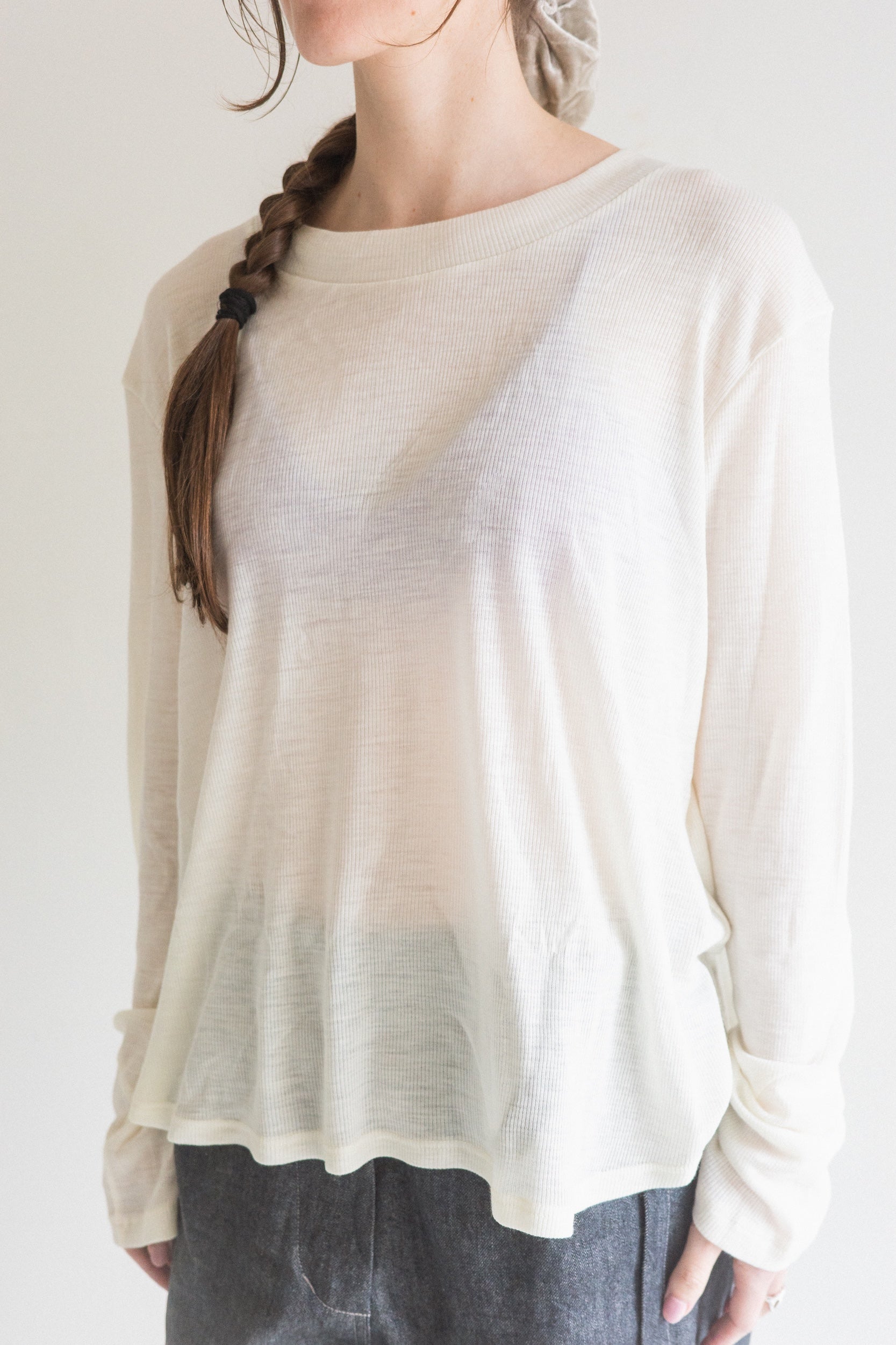 A relaxed long sleeve tee, made of fine 100% merino rib. Featuring a diagonal seam through the arm, centre back seam and a “Tuxedo” inspired hem. A 2025 twist with details inspired by what’s come before :)