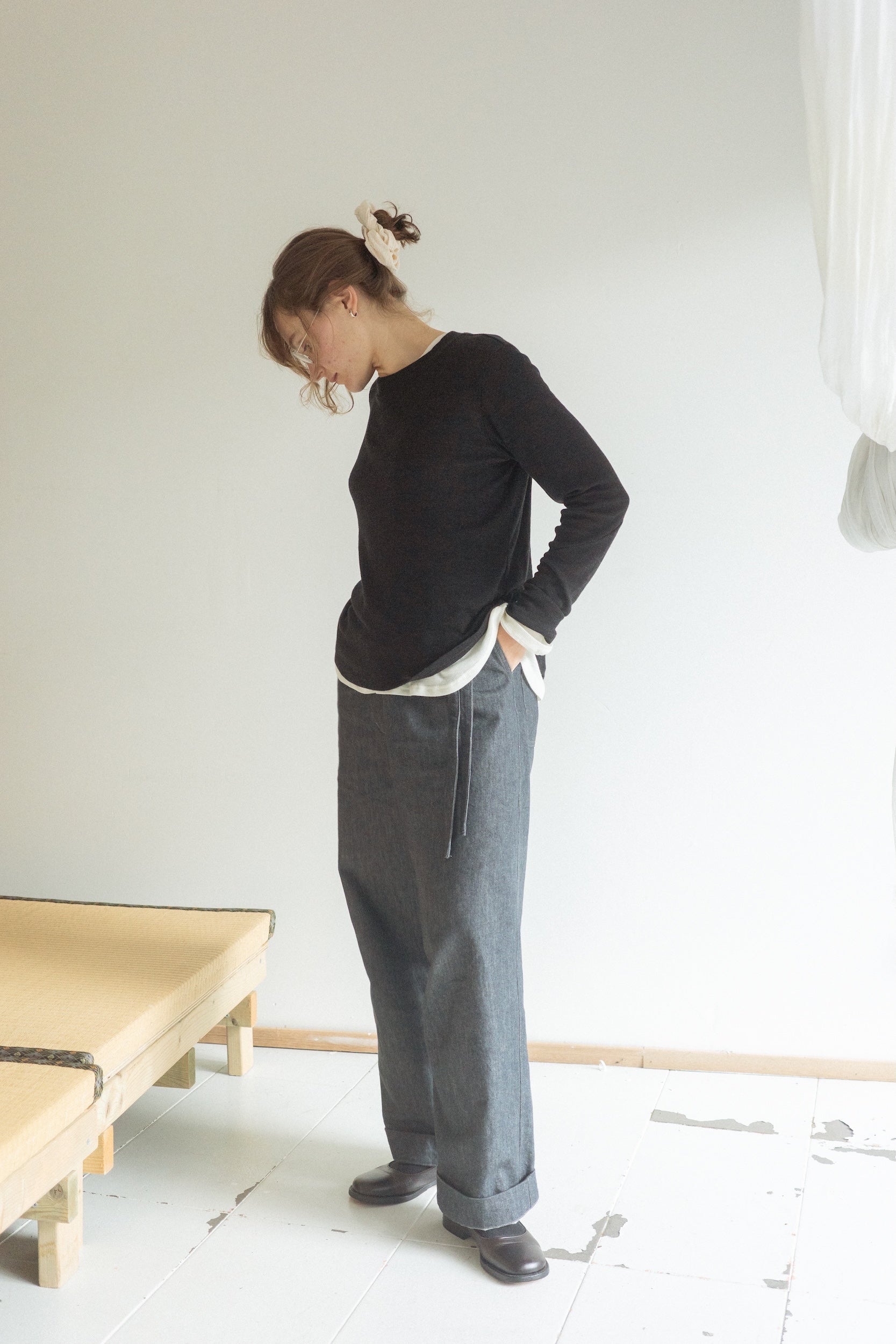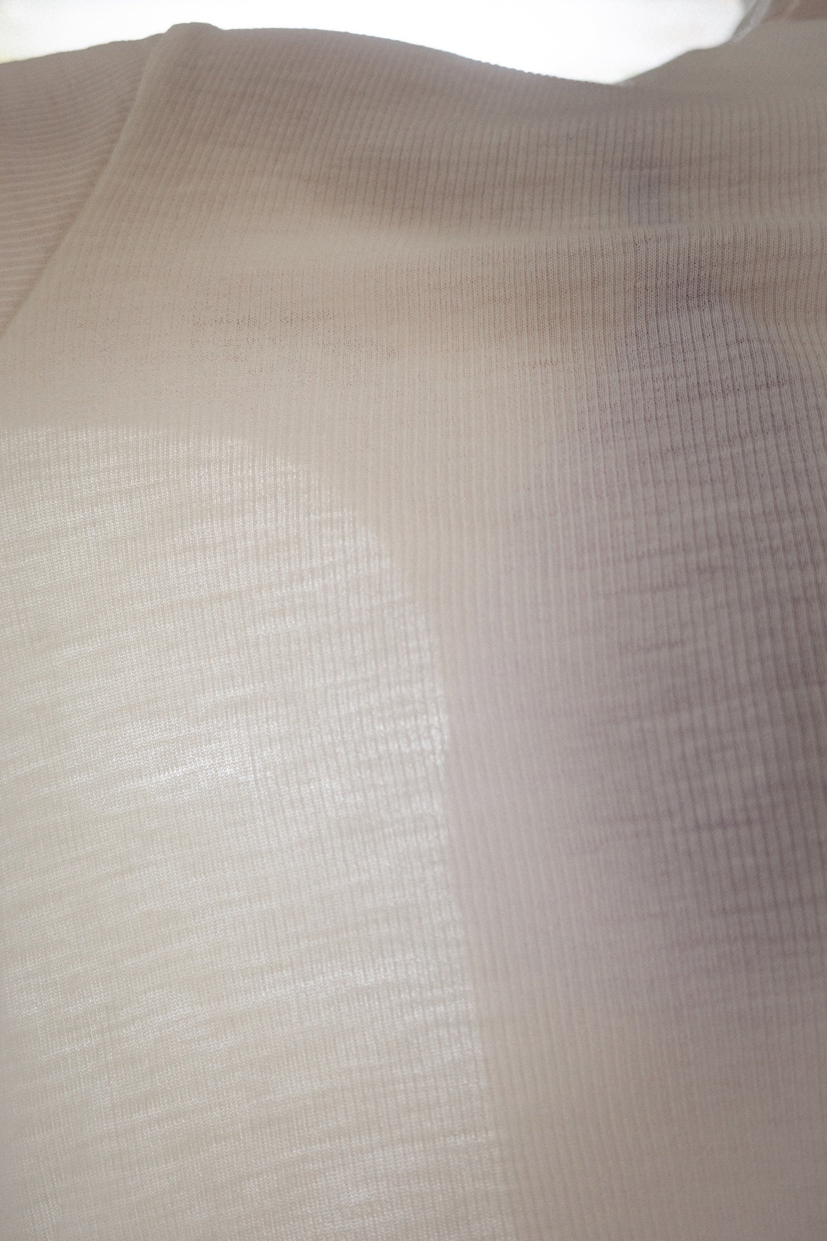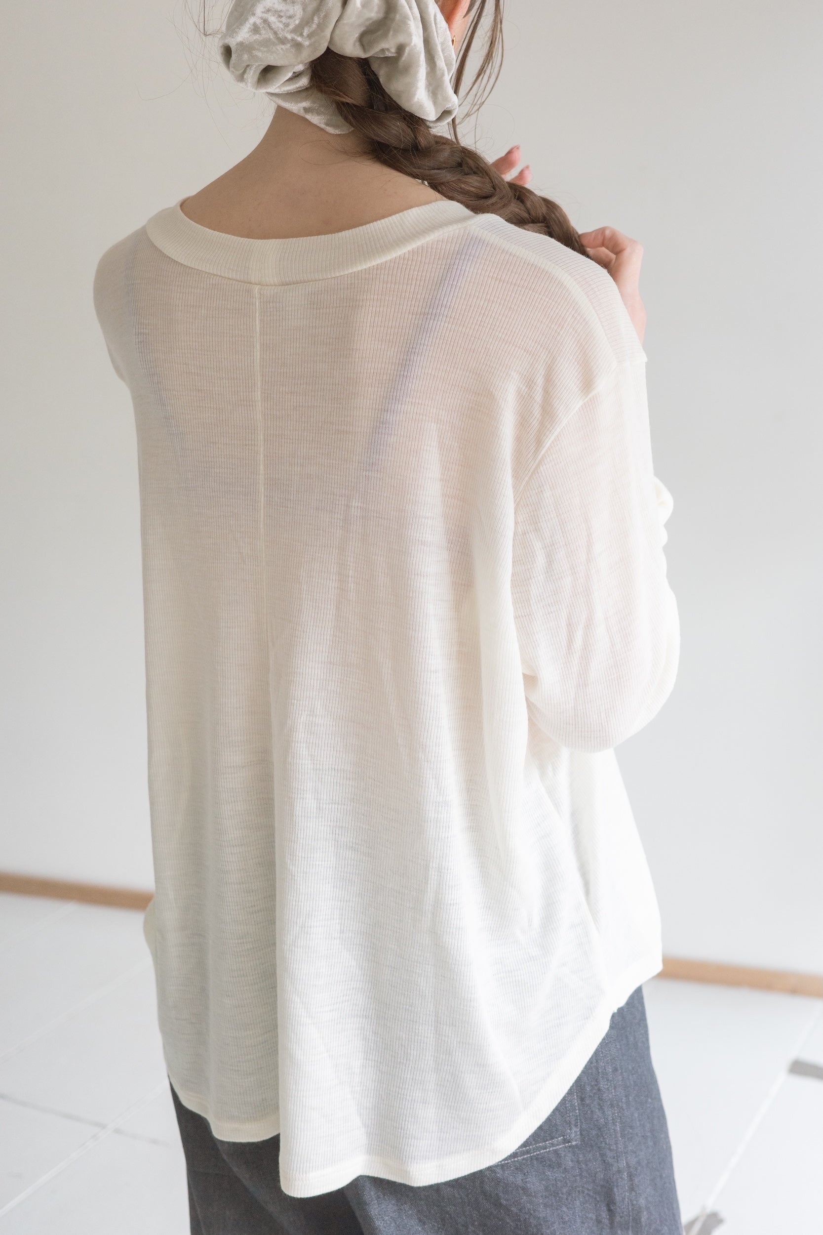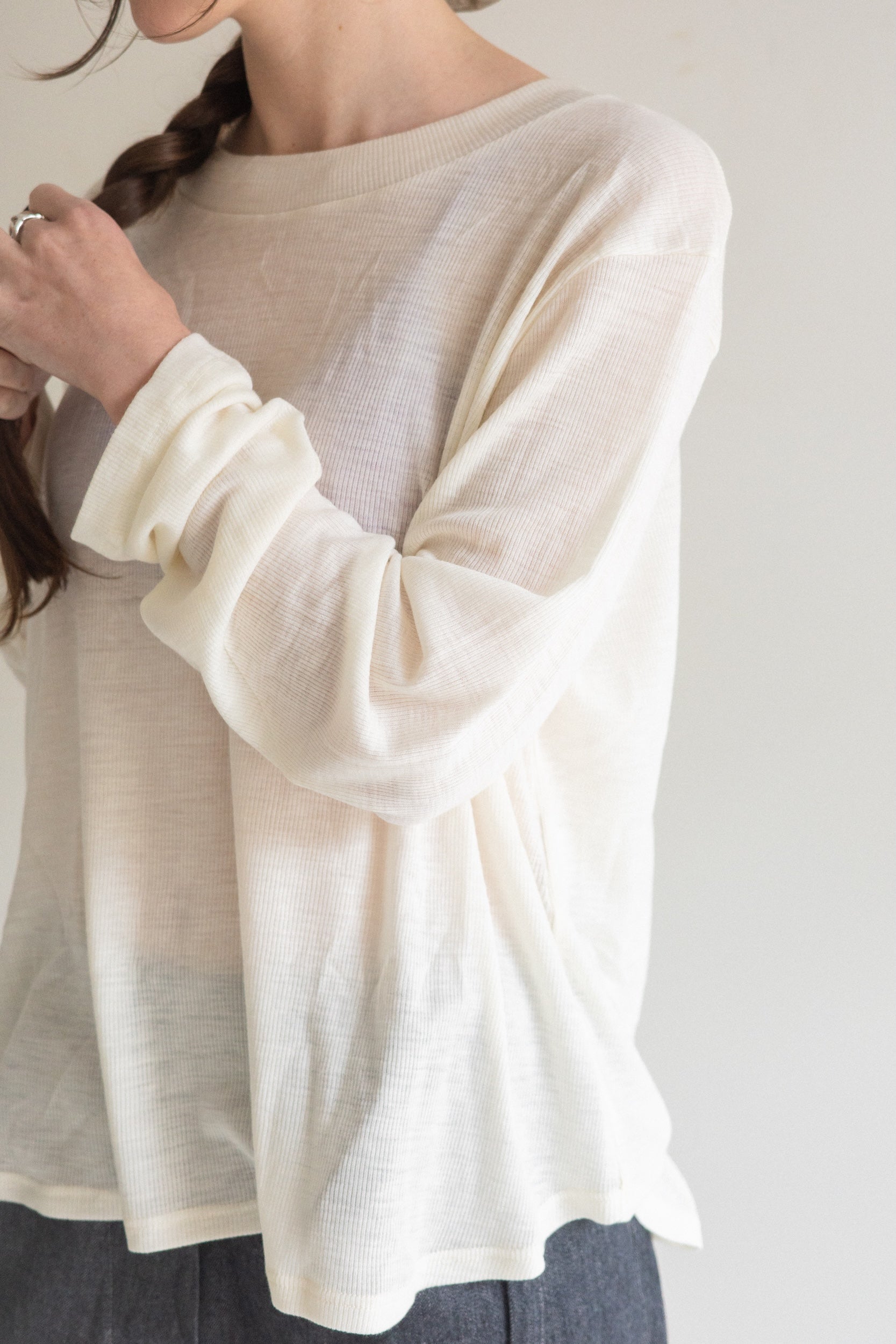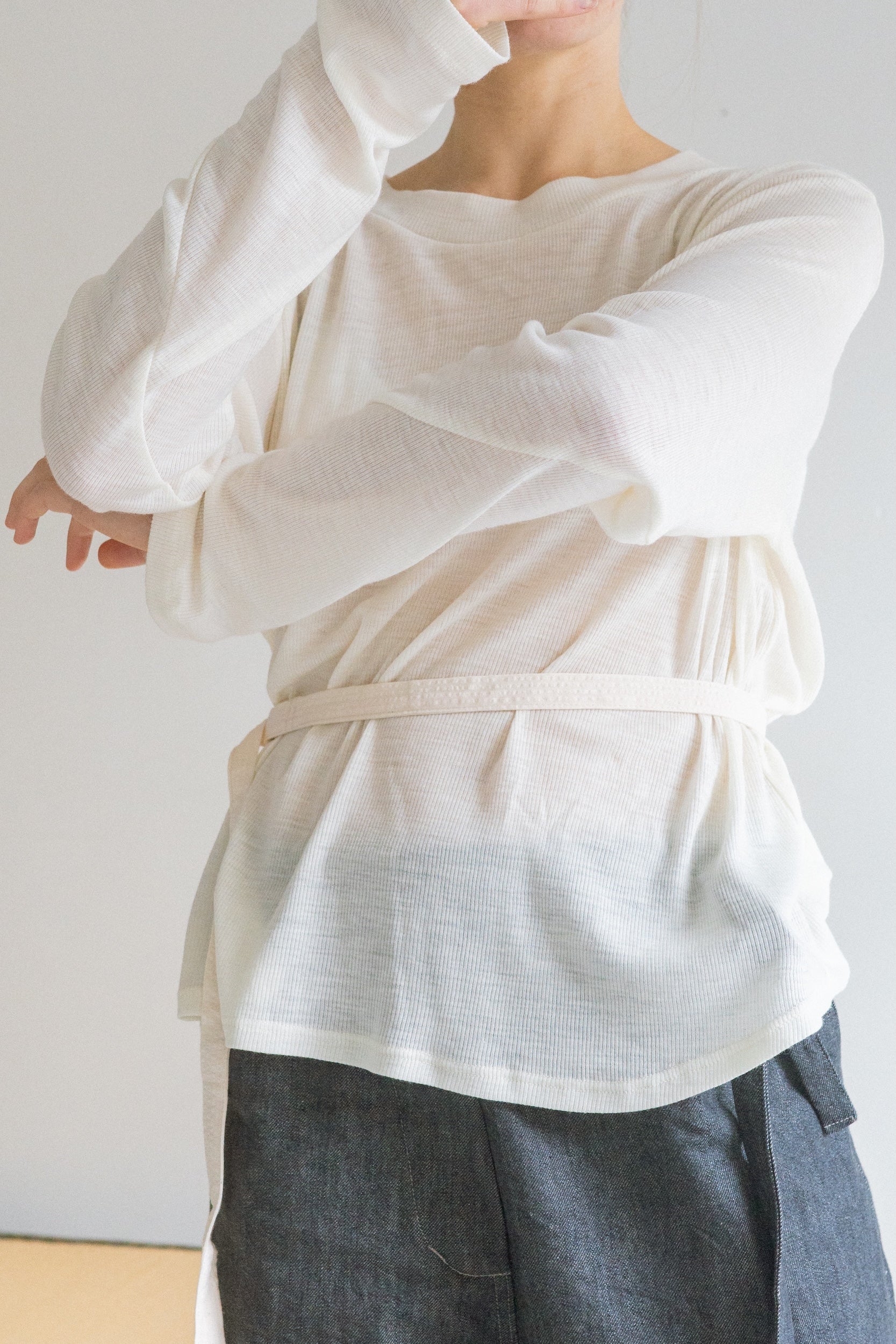 A relaxed long sleeve tee, made of fine 100% merino rib. Featuring a diagonal seam through the arm, centre back seam and a “Tuxedo” inspired hem. A 2025 twist with details inspired by what’s come before :)